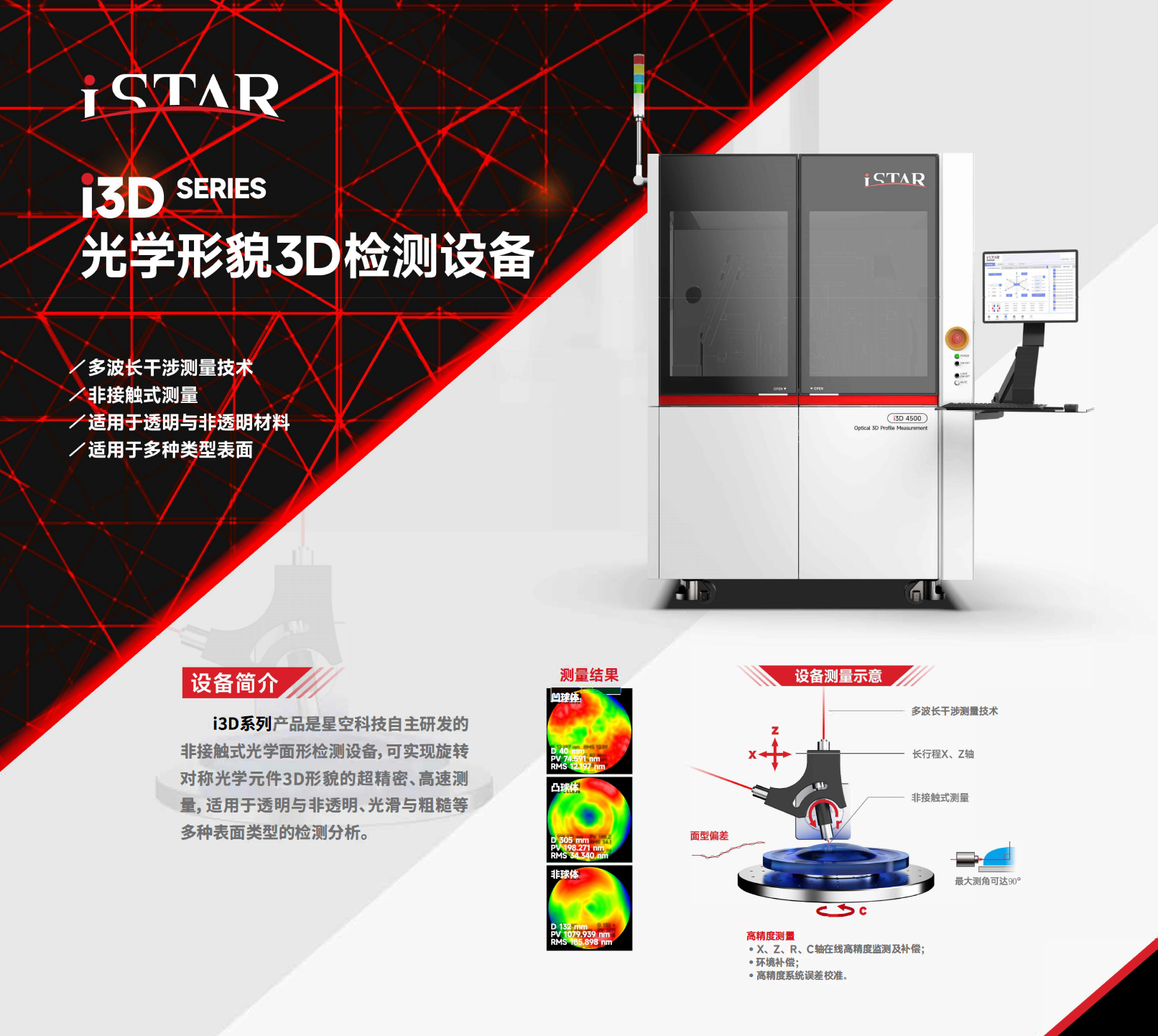 i3D系列产品是星空科技自主研发的非接触式光学面形检测设备, 可实现旋转对称光学元件3D形貌的超精密、高速测量, 适用千透明与非透明、光滑与粗糙等多种表面类型的检测分析。